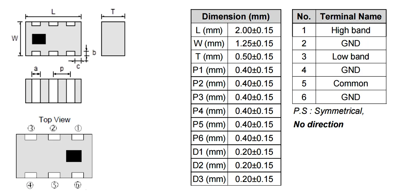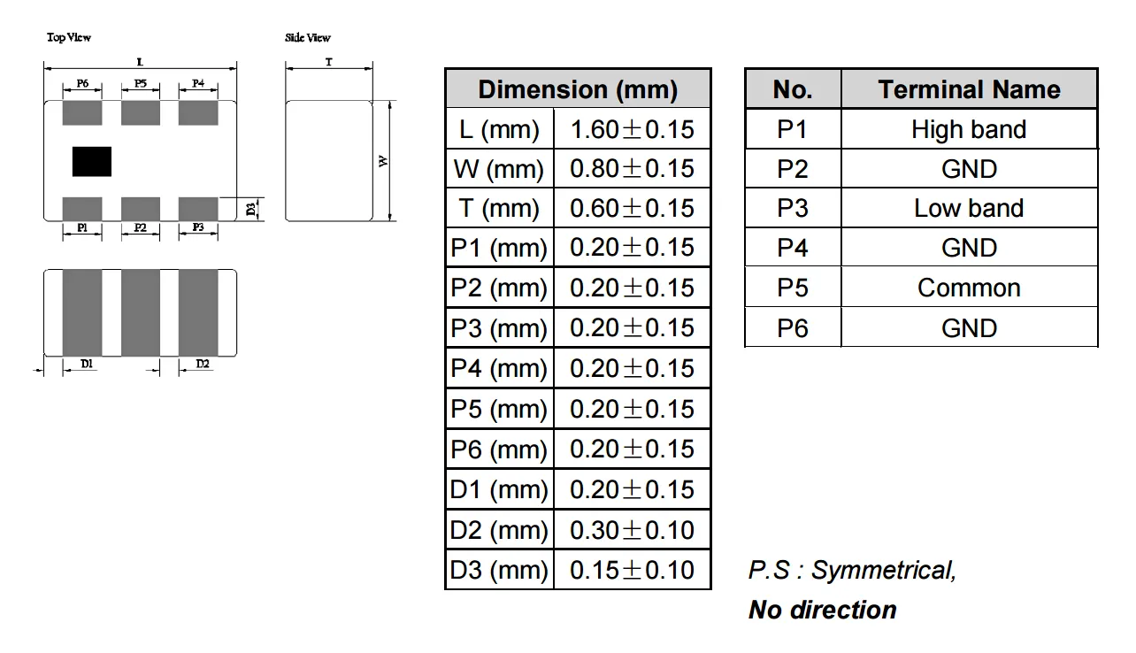 - 超小型サイズ:SMD-6Pパッケージ、わずか0.8 x 1.6mm、0603規格に適合し、PCBスペースを節約します。